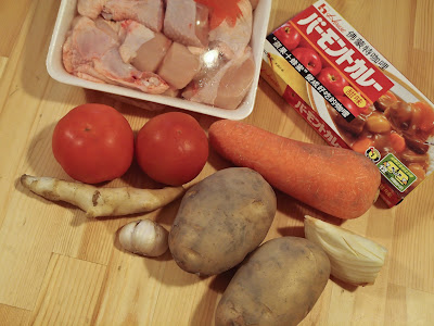 材料:蕃茄、洋蔥、紅蘿蔔、馬鈴薯、雞腿肉,薑和蒜,義式香料、月桂葉1-2片,咖哩塊或咖哩粉、奶油